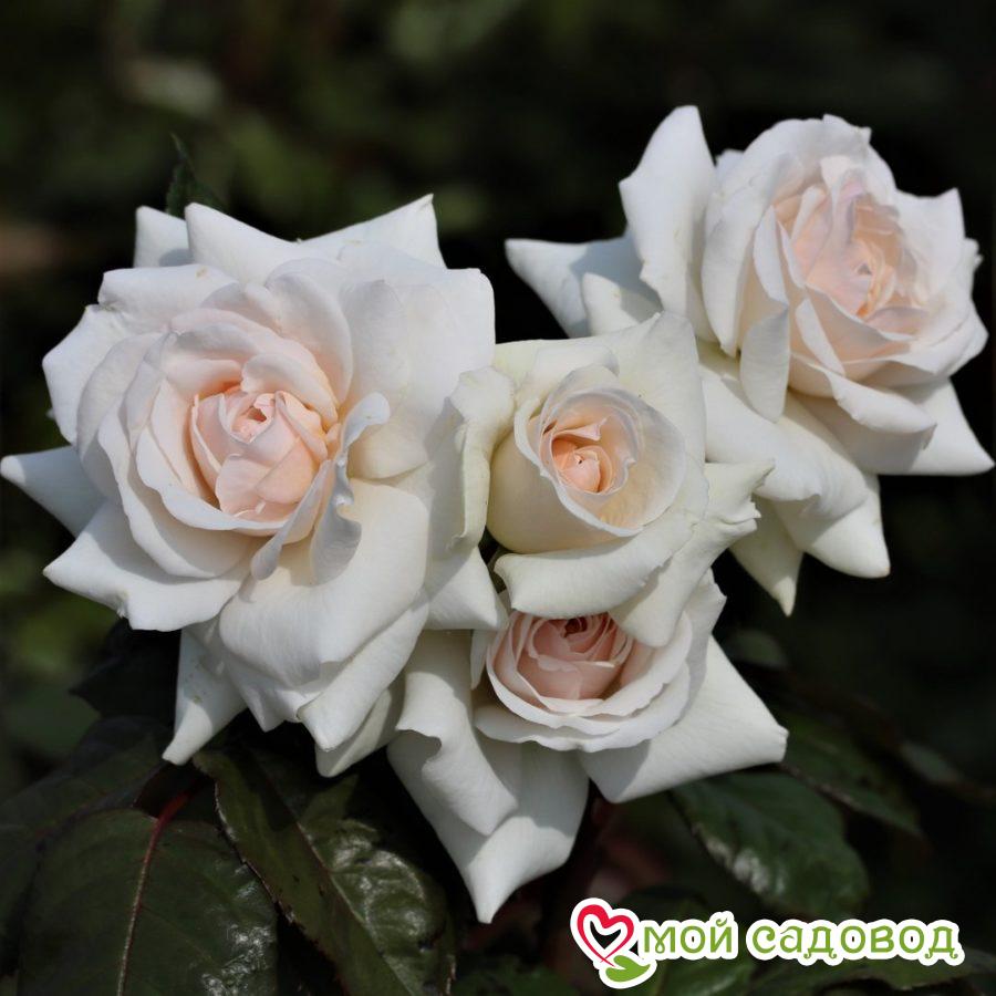 У этого сорта основное преимущество цветы. В они очень пышные по сравнению с другими видами плетистых роз, на фоне темных листьев они выглядят очень белыми, с розовато-кремовым цветом центра цветка. Каждый из них имеет более 50 лепестков, размер 12 см и тоже редкость для этих роз. Побеги практически покрыты крупными соцветиями, бутоны, растущие поодиночке попадаются редко. Большой плюс — длительное цветения, соцветия образуются почти без перерыва весь сезон, при теплой осени соцветия появляются снова.
